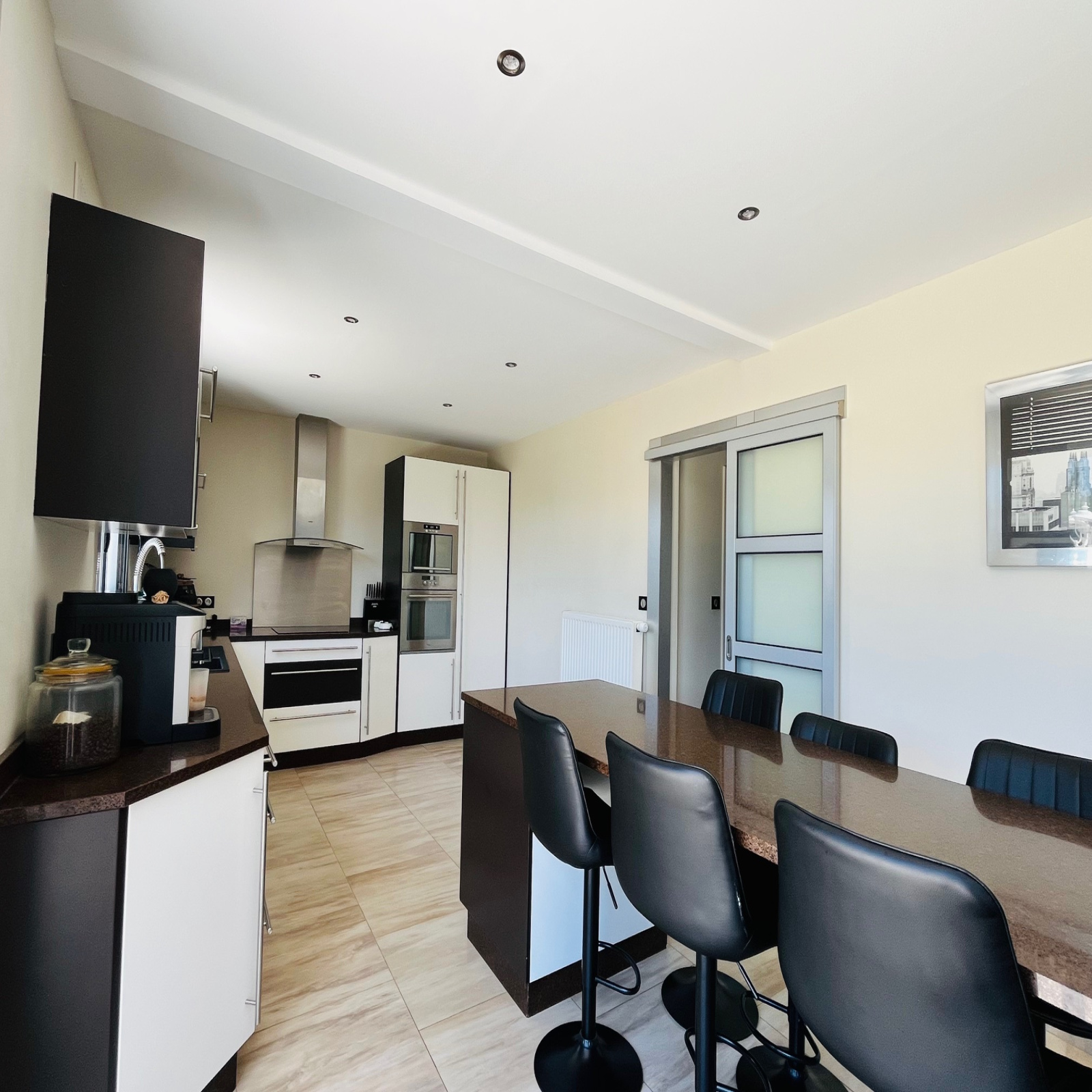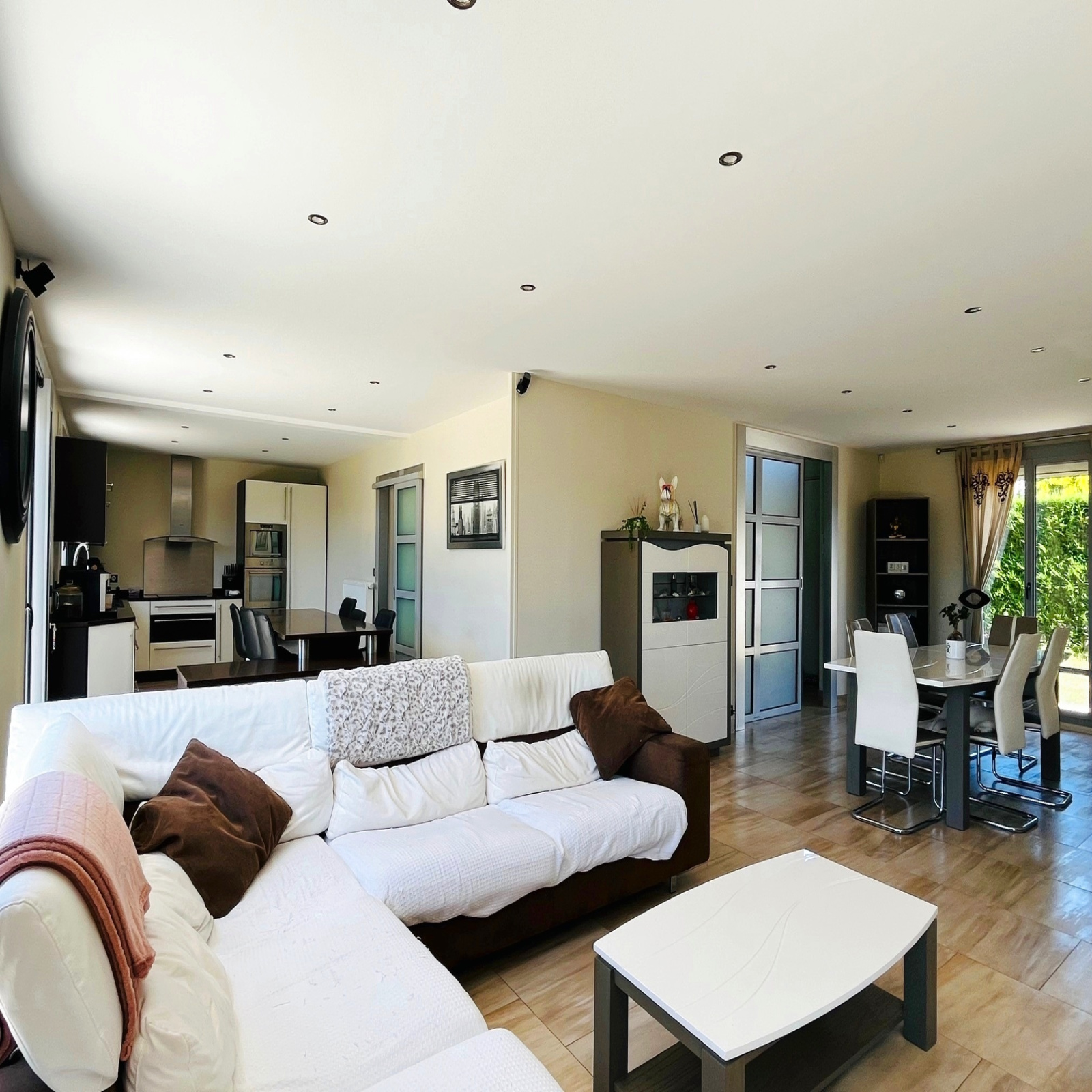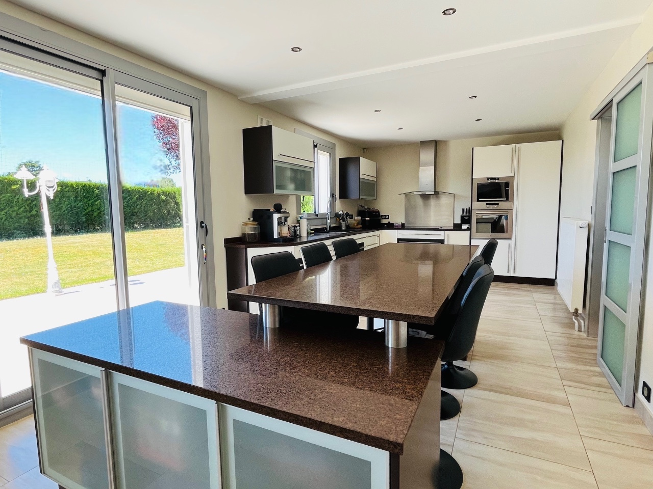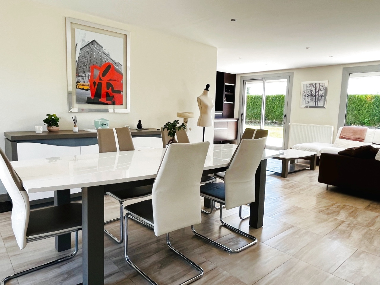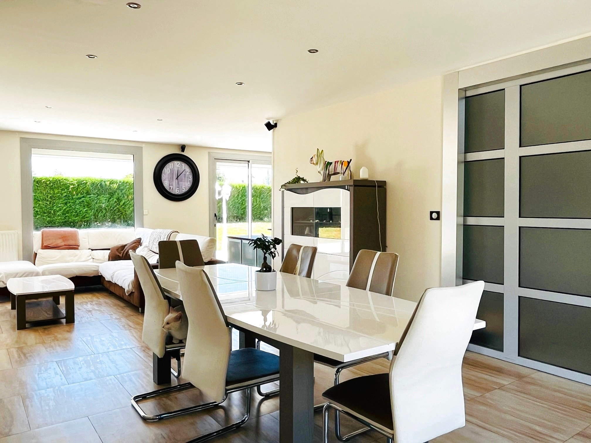 Cette magnifique maison familiale se compose au rez-de-chaussée d'une vaste entrée avec placards, d'un double salon-séjour très lumineux avec cuisine équipée ouverte sur la pièce de vie (65 m2), d'une chambre, d'un cellier (pouvant facilement être transformé en salle de douches) et d'un wc indépendant.